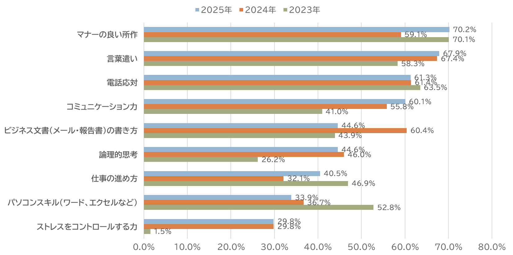 新入社員に仕事を進める上での不安について聞いたところ、最多は「マナーの良い所作」70.2%でした。次いで「言葉遣い」67.9%、「電話応対」61.3%となっており、ビジネスマナーに関する項目が上位を占めています。また、「仕事の進め方」は前年に比べて増加、「パソコンスキル」に対する不安は減少傾向にあります。