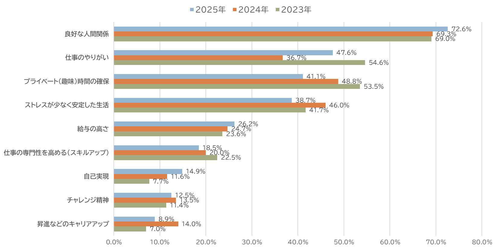 新入社員に仕事を進める上で大切にしたいことを聞いたところ、最多は「良好な人間関係」72.6%でした。次いで「仕事のやりがい」47.6%、「プライベート(趣味)の確保」41.1%、「ストレスが少なく安定した生活」38.7%となっており、「仕事のやりがい」が昨年に比べて大きく増えました。