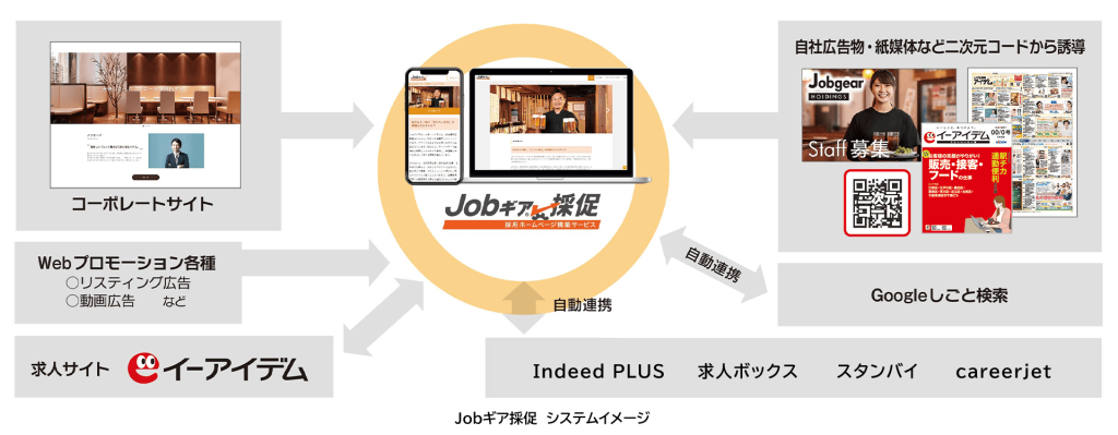 『Jobギア採促』は、求人の掲載や求職者の集客、応募者の管理までをまとめて行えるSaaS形式のクラウドサービスです。採用情報や事業内容、スタッフインタビューなどのコンテンツ掲載に加え、あらゆる角度からの効果測定も可能。企業の効果的な募集活動やミスマッチ防止、採用業務効率化による採用コスト削減をサポートしています。また、Web面接機能や適性検査、採用動画、自動面接設定、応募者一元管理、多言語化対応、Indeed PLUS連携、採用ステータス連携によるマッチング精度向上など、常に最新の機能を搭載。情報セキュリティに関する国際基準も取得しています。