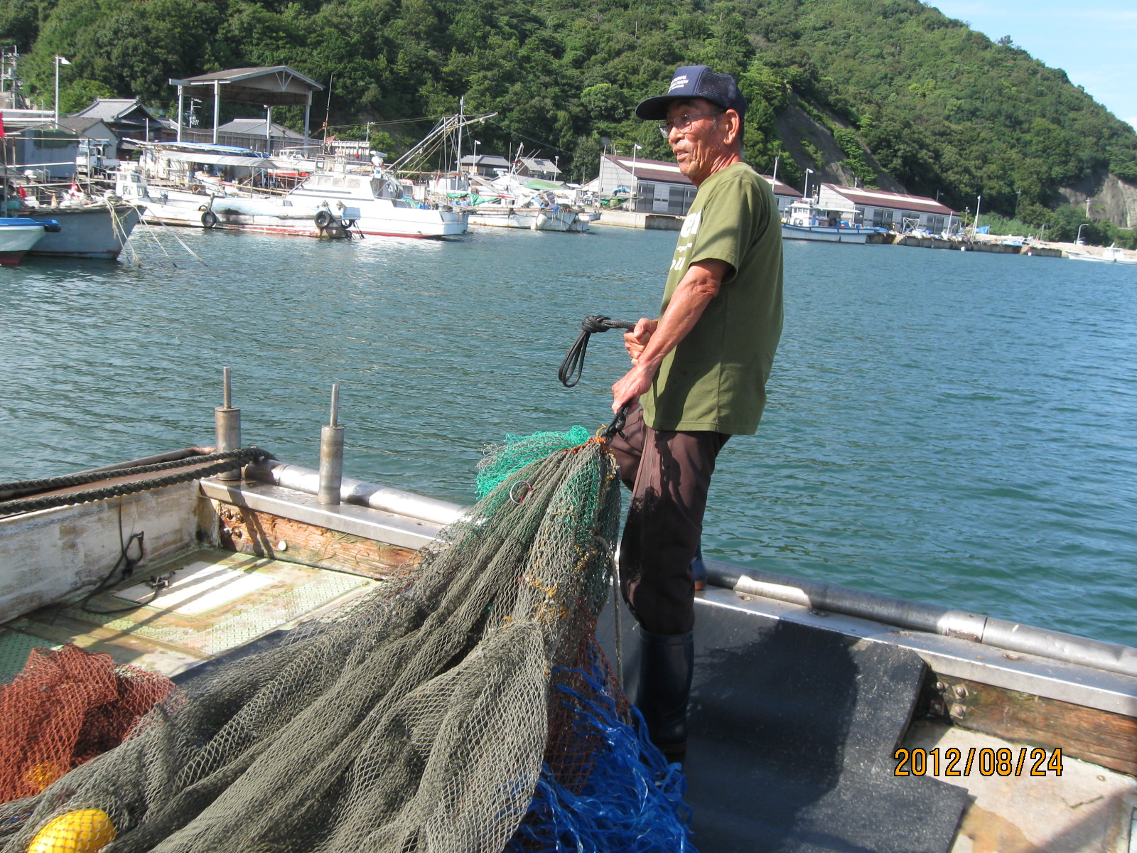 - この写真は私の祖父が漁に使う網の手入れをしているところです。祖父は漁師をしています。網の出し入れなどの重労働を行なう祖父はとても70歳には見えません。「燃料費は上がるのに漁獲高は減っていて困る。」と話してくれました。漁師は大変な仕事だけど、これからも頑張って欲しいと思っています。