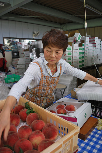 - 私が小さい頃から、毎年夏になると山梨の桃農園を訪れています。この写真はその農園を経営するおばさんが桃の選別をしながら箱詰めをしているところです。いつもの優しい笑顔は消え、真剣な表情・まなざしで働いていました。その姿から、大切に育てた桃への愛やお客さんへの愛、そして何よりも仕事への愛が感じられます。