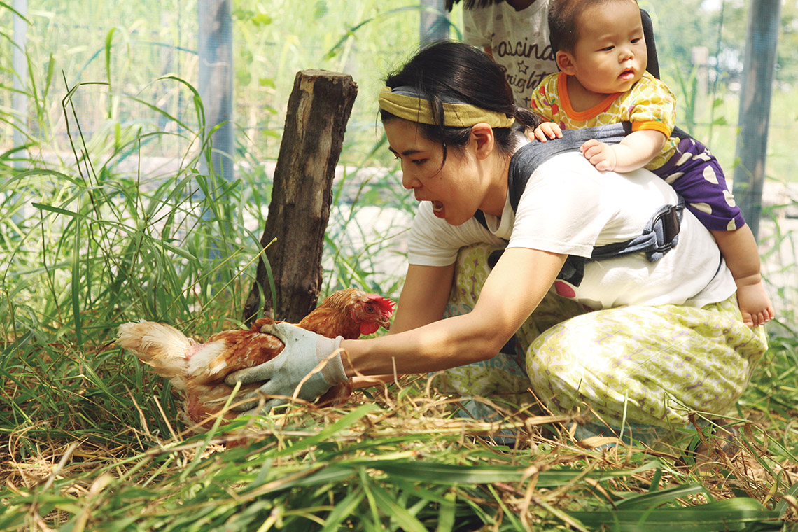- この作品を撮ったのは、ぶどう園農家のぶどう園です。お母さんはまだ一歳にもならない赤ちゃんをおんぶしながら作業をされていて、まさに「働くお母さん」だなと思いました。鶏を捕まえようとしているお母さんと、赤ちゃんの表情やしぐさが気に入っています。鶏も子供もいて、賑やかで楽しい撮影時間でした。