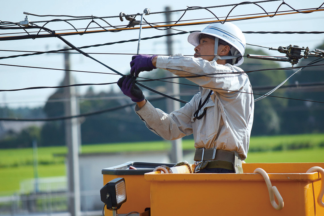 夏休みに、家の前に数台のトラックと高所作業車が2台入ってきました。作業は互いに声を掛け合い、暑さなど感じさせない真剣な表情でケーブルを慎重につないでいました。その視線はプロの目。そんな作業をする姿につながる力を感じ、僕はカメラのシャッターを押しました。