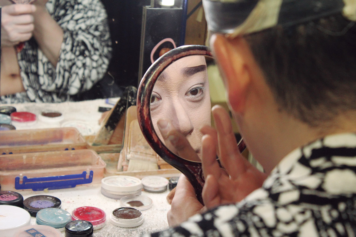 - 大衆演劇の座長さんがメイクしている姿を撮影させて頂いたときの写真です。メイクをすることで、見た目だけじゃなく気持ちも「演じる自分」「働く自分」に化けていっているのかなと感じました。鏡にうつっている姿がとても魅力的でシャッターを切っていました。